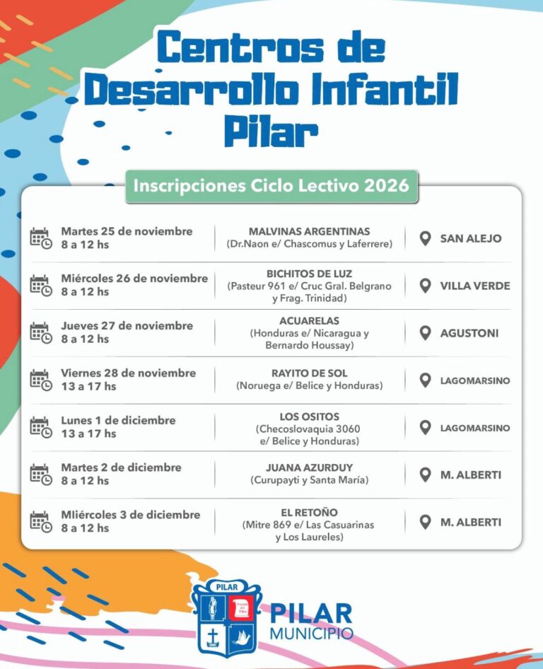 De esta forma, las familias con niños y niñas de 2 y 3 años de edad, con residencia en el partido de Pilar, podrán inscribirlos de forma gratuita en cualquiera de los 13 centros, que se encuentran a lo largo de todo el distrito.