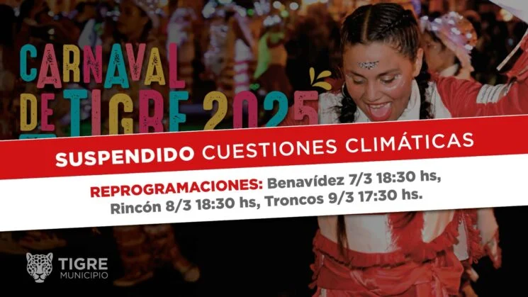 A raíz del mal clima pronosticado para este fin de semana, el Municipio de Tigre informa a la comunidad que los Carnavales 2025 se reprogramarán para el próximo viernes 7 (en Benavídez), sábado 8 (en Rincón de Milberg) y domingo 9 (en Troncos del Talar).